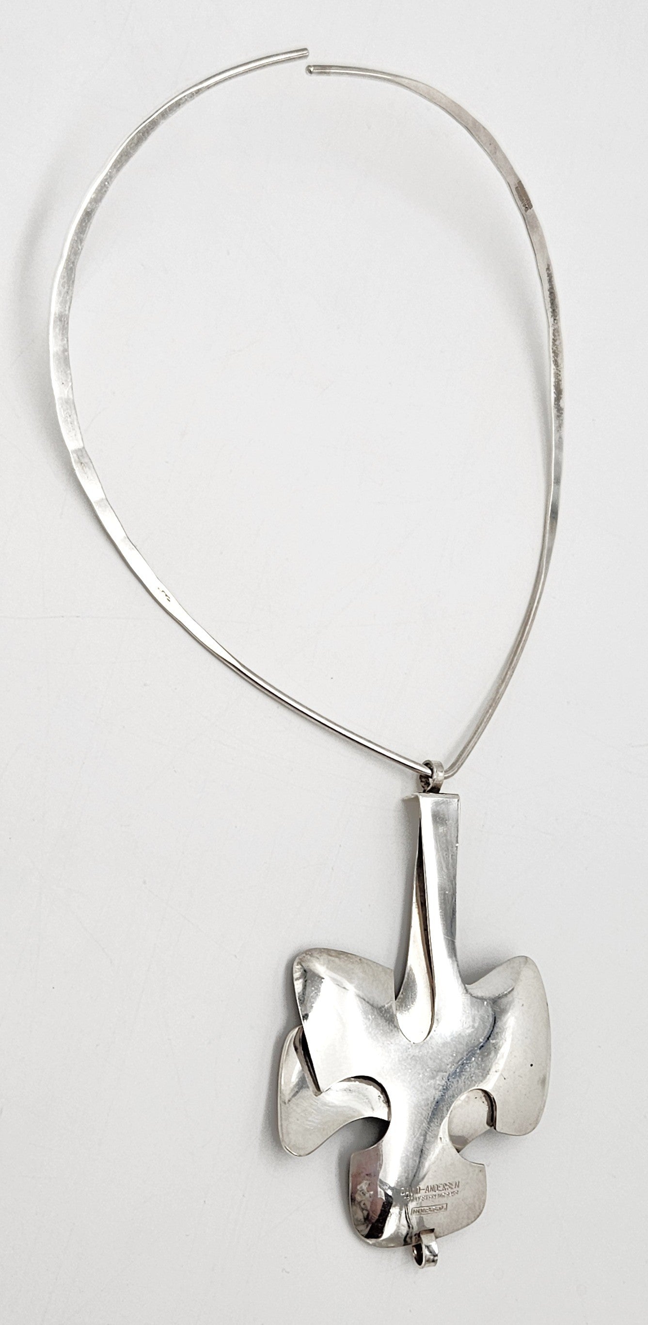 Pendant is paired with an original Andersen V-Style Torque collar/neck ring that has a lightly hammered finish. Neck ring is pliable and could accommodate a large neck size. Both pieces are in excellent condition with only light patina and light wear.