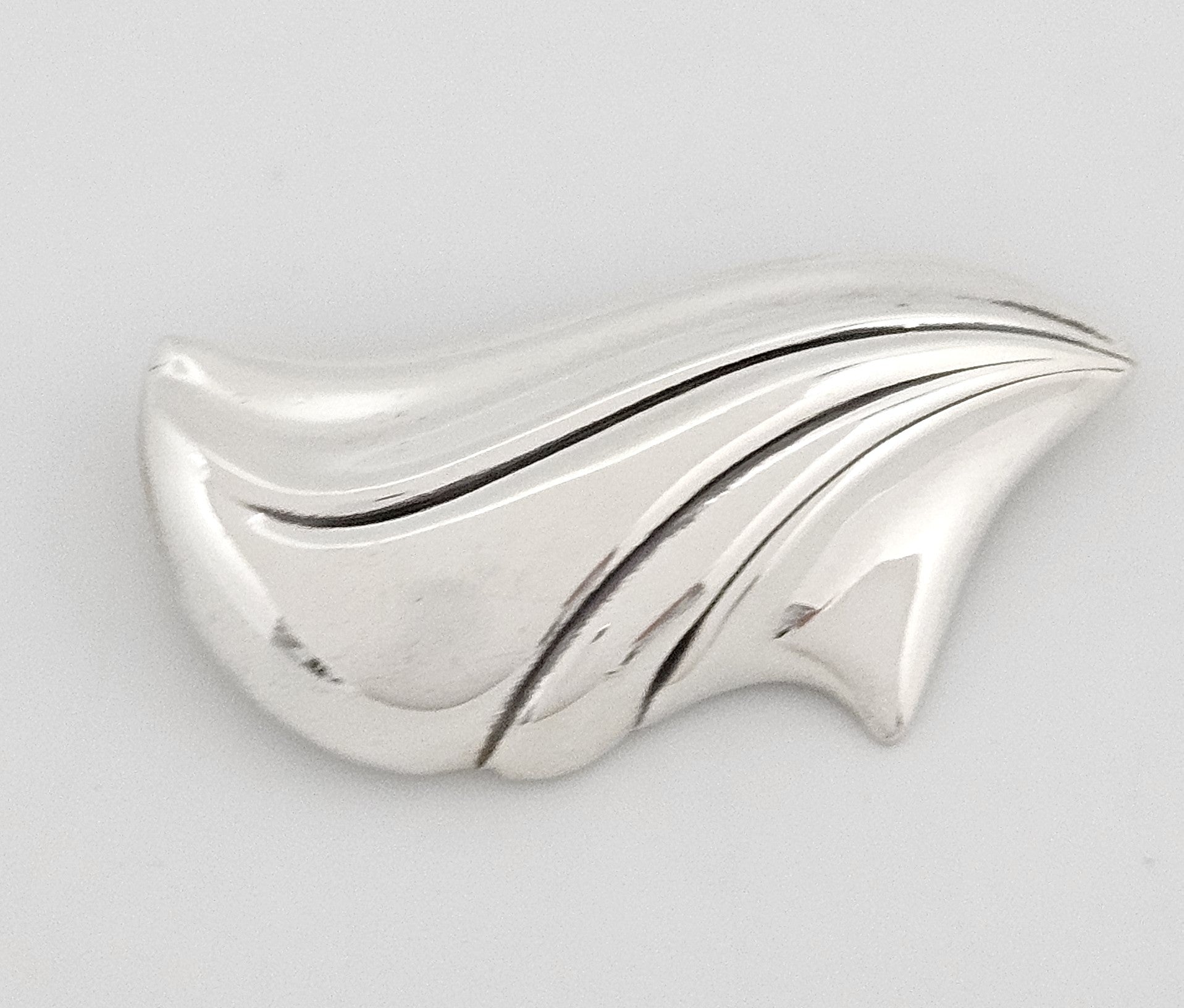 Positively stunning modernist vintage Kabana designer brooch. Brooch is puffy style in a wing like pattern with an extremely shiny mirror like finish. No dings or damage of any kind and pin back functions properly. It will be professionally polished before shipping. Please excuse the lines or reflections, as it's extremely shiny and hard to photograph. Included with purchase are 2 converters so it can be worn as a pendant either vertically or horizontally.
