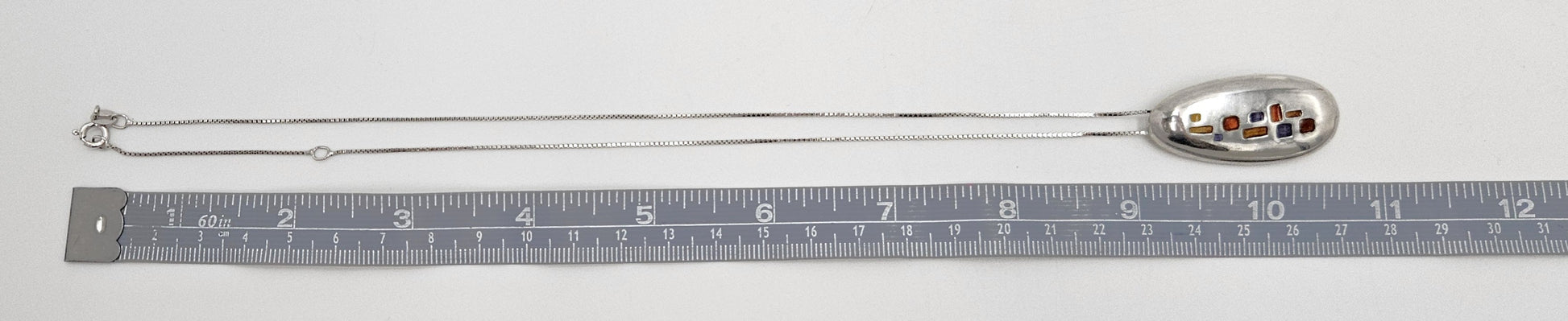 Beautiful and colorful sterling silver pendant with a variety of colors of inlaid enamel. Enamel is crisp, fully intact and bright with no damage. Pendant has been professionally polished and looks fantastic.