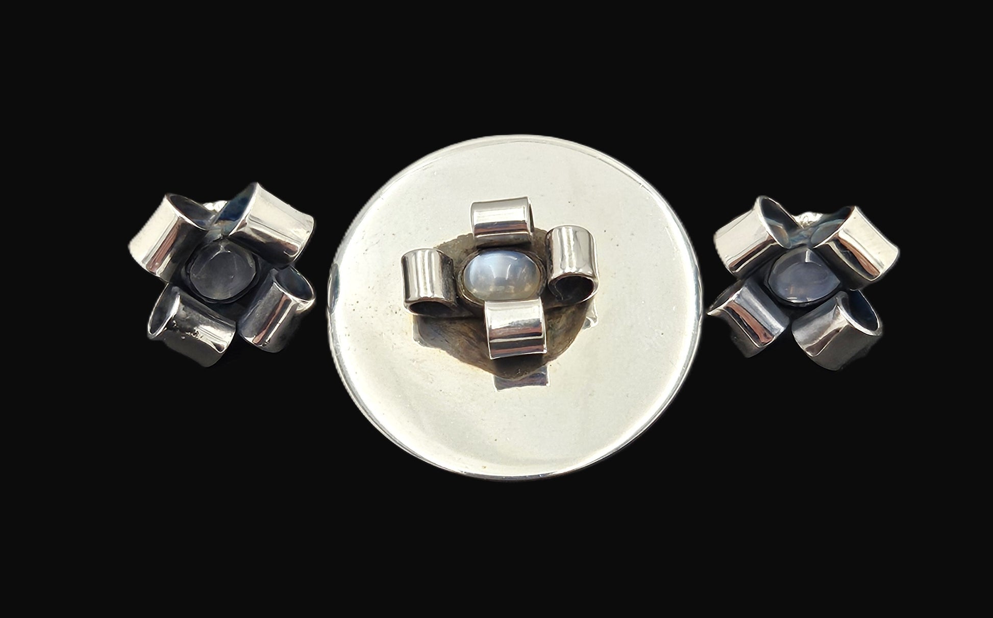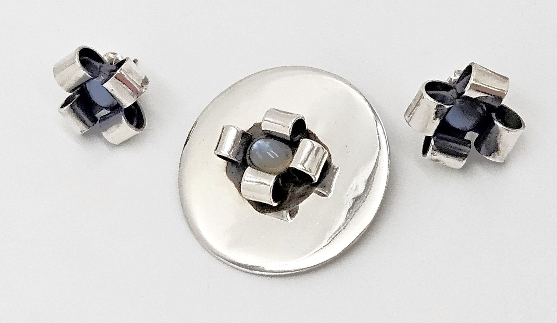 Sam Kramer Sterling Silver & Moonstone Brooch and Earrings Demi Parure Set