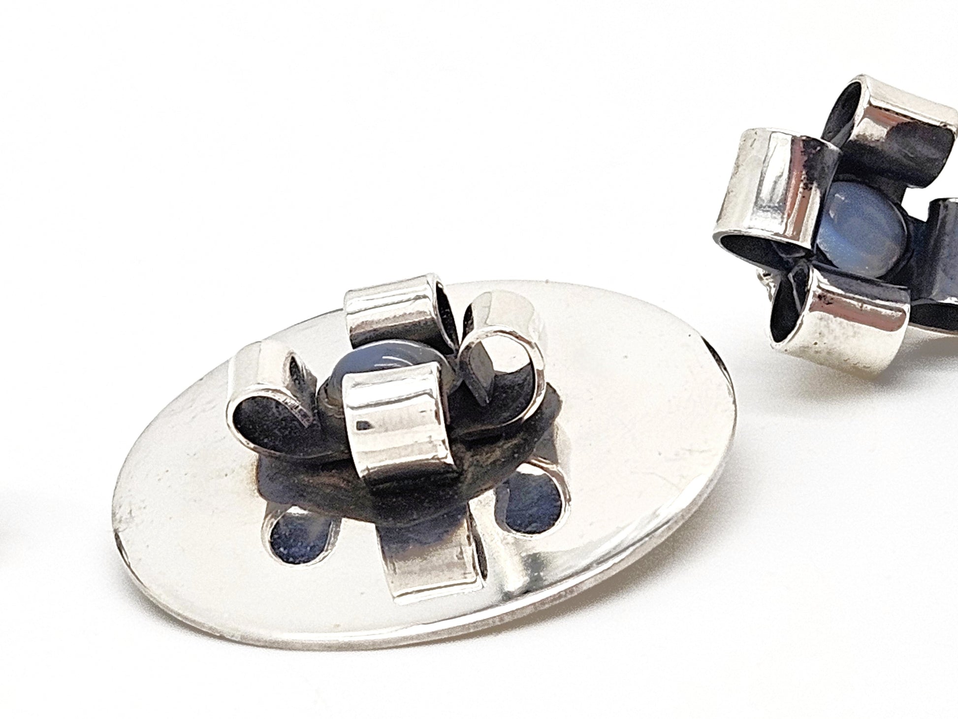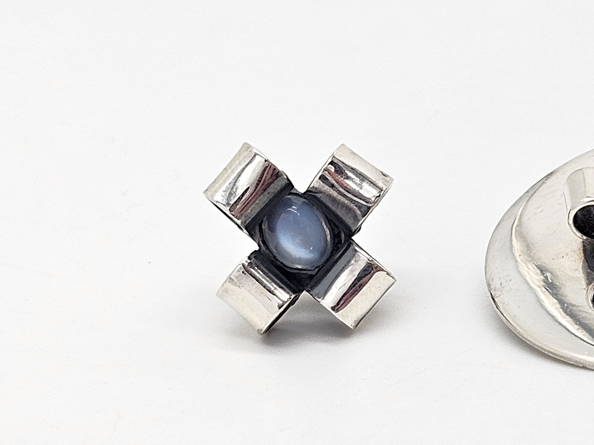 Set features sterling silver and bezel set moonstones with curled sterling accents that have been oxidized for depth and a dramatic flair. I've given the set a light cleaning and polish. Really did not need much as all three pieces are in exceptional condition, no deep scratches or damage of any kind. Earrings have been converted to pierced style post backs with new 925 earrings backs by a professional jeweler. Included with purchase is a converter so you can wear the brooch as a pendant if preferred.